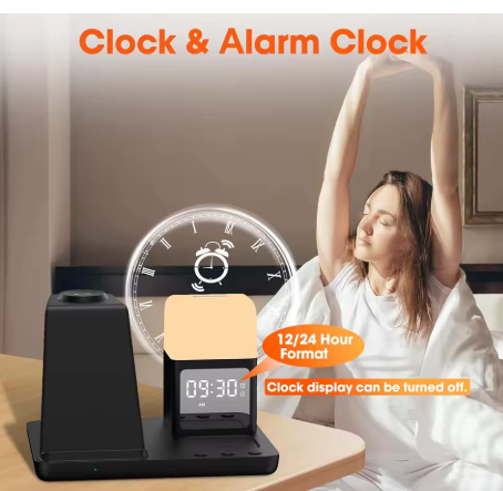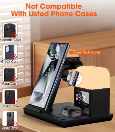 Este carregador multifuncional oferece até 15W de potência para carregar seus telefones, relógios inteligentes e fones de ouvido simultaneamente via conexão Tipo C. Com saída móvel de até 15W, saída de fones em 3W e relógios em 2,5W, garante eficiência de até 73% a uma distância de transmissão de 6mm. Ideal para quem busca praticidade, conta também com luz noturna integrada e função despertador, unindo tecnologia e conforto em um único suporte de mesa. Compatível especialmente com Samsung Watch. Produto sujeito a atualizações visuais.